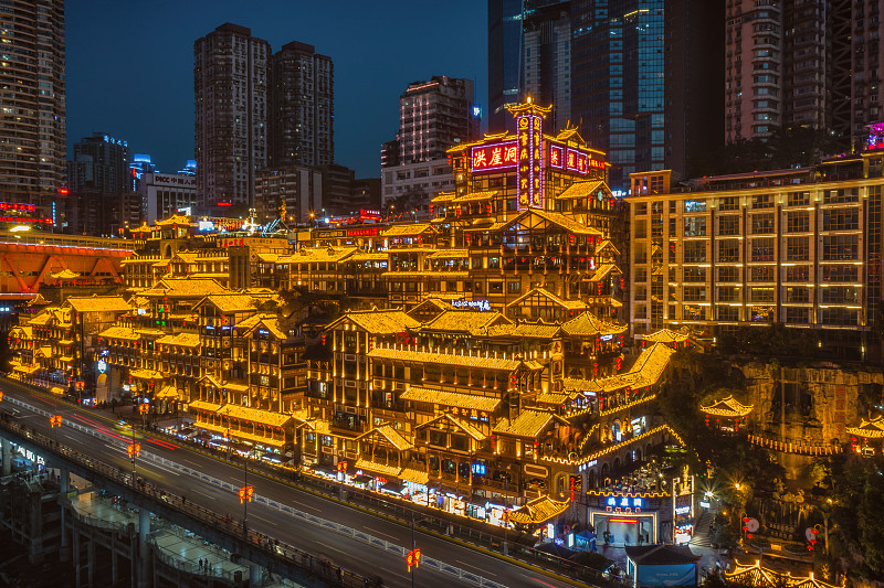 • Stroll through Hongyadong Ancient Town : Adjacent to Jiefangbei, Hongyadong offers a glimpse into Chongqing's traditional architecture and culture. Its wooden buildings and lantern-lit alleys create a picturesque backdrop, especially at night when the area is illuminated. Don't miss the chance to take a photo from the bridge overlooking the town for a stunning view.